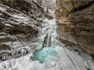 Walk along dramatic steel “catwalks” built directly into the canyon walls. This easy hike takes you deep into the limestone gorge to witness powerful waterfalls and the lush, mossy beauty of Johnston Creek.